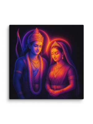 Celebrate divine love and harmony with this Rama and Sita canvas, a radiant piece of spiritual art that brings calm energy and beauty into your home. The glowing violet and golden tones create a warm and sacred atmosphere, perfect for living rooms, prayer spaces, or as a meaningful Diwali gift. Each canvas is made to…